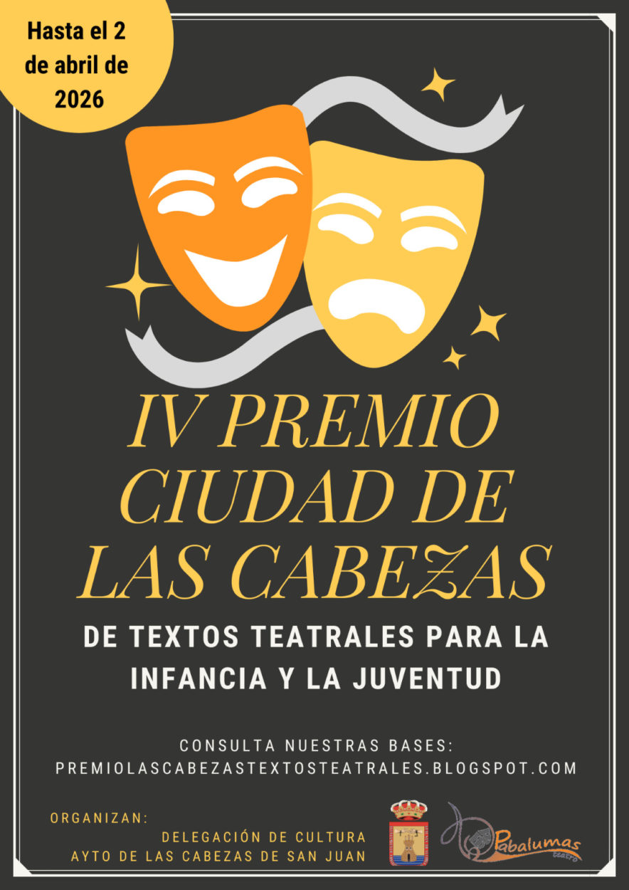 La Delegación de Cultura del Ayuntamiento de Las Cabezas de San Juan y la Asociación Cultural Pabalumas Teatro organizan el IV Premio “Ciudad de Las Cabezas” de Textos Teatrales para la Infancia y la Juventud con el objetivo de estimular y suscitar un mayor interés por un teatro Infantil y Juvenil de calidad. Un concurso abierto a autores de cualquier nacionalidad que presenten obras inéditas destinadas al público más joven. Se establece un primer premio consistente en 500 € y la publicación de la obra y se podrá conceder un accésit cuyo premio consistirá en la publicación del texto junto con la obra ganadora. El plazo de presentación de originales finalizará el próximo dos de abril. El fallo del jurado se dará a conocer antes del veintisiete de mayo y la entrega de premios se realizará en la Gala de Clausura del XII Certamen de Teatro Infantil y Juvenil “Ciudad de Las Cabezas”, el próximo siete de junio.