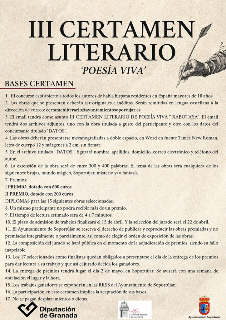 El Ayuntamiento de Soportújar (Granada) desde la concejalía de Cultura queremos promover el arte de las letras y presentamos el III Certamen de Literatura y Poesía Villa de Xabotaya que se celebrará el próximo 2 de mayo de 2026, buscamos así valorar tanto las piezas presentadas a concurso como la interpretación de las mismas.