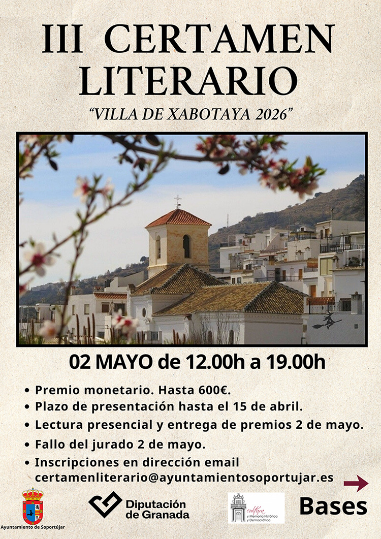 El Ayuntamiento de Soportújar (Granada) desde la concejalía de Cultura queremos promover el arte de las letras y presentamos el III Certamen de Literatura y Poesía Villa de Xabotaya que se celebrará el próximo 2 de mayo de 2026, buscamos así valorar tanto las piezas presentadas a concurso como la interpretación de las mismas.